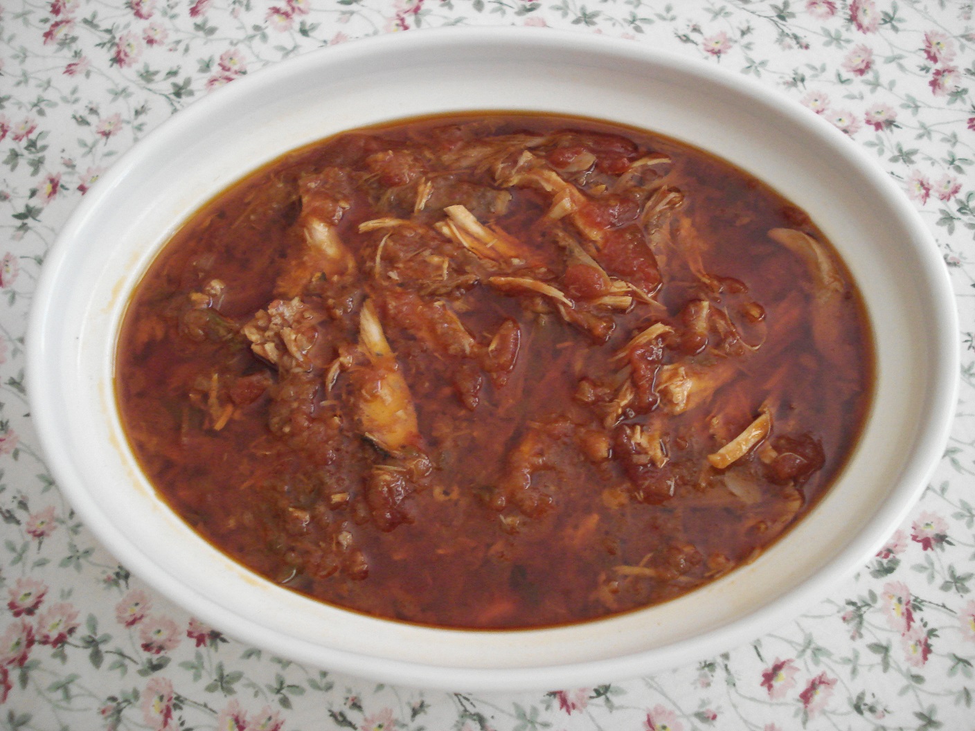 J’enlève la feuille de laurier et la feuille de thym et je dépose la poule sur un grand plat. La poule est véritablement très cuite, j’enlève à la main le reste de couenne, la peau de la poule et les os et j’émiette, toujours à la main, la chair que je mélange aux légumes.
